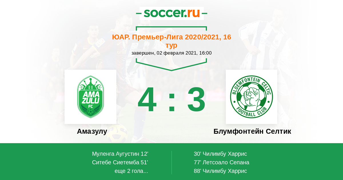 ЮАР. Премьер-Лига 24.08.2020 Амазулу Логотип футбольный клуб Амазулу (Дурбан) 2:2 Логотип футбольный клуб Блумфонтейн Селтик Блумфонтейн Селтик