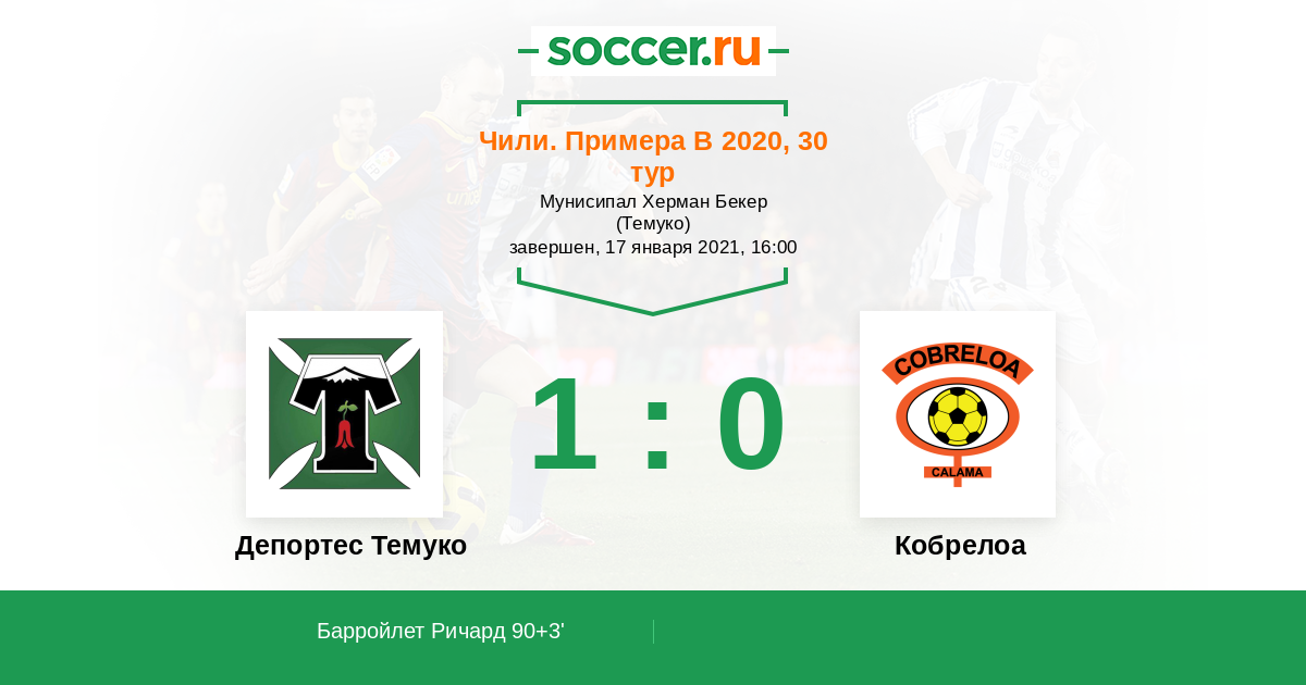 Чили. Примера В 30.09.2020 Кобрелоа Логотип футбольный клуб Кобрелоа (Калама) 1:0 Логотип футбольный клуб Депортес Темуко Депортес Темуко
