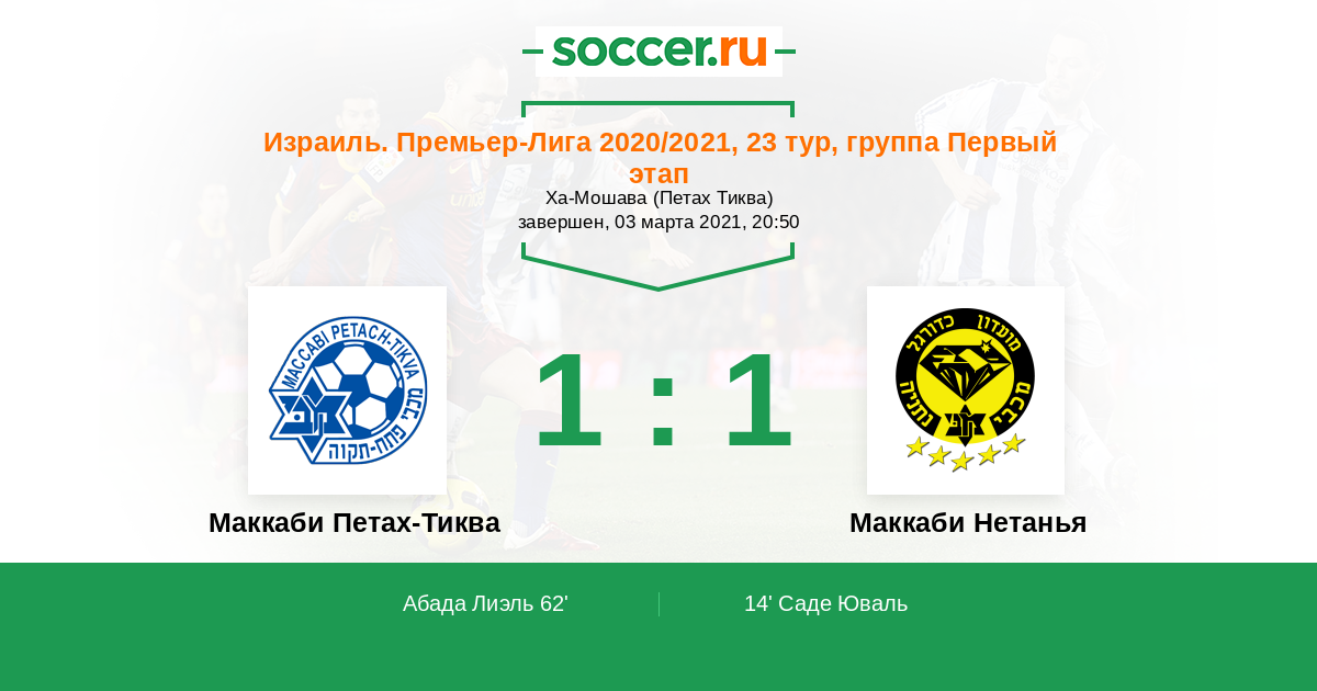Израиль. Премьер-Лига 02.04.2011 Маккаби Нетанья Логотип футбольный клуб Маккаби Нетанья 2:2 Логотип футбольный клуб Маккаби Петах-Тиква Маккаби Петах-Тиква