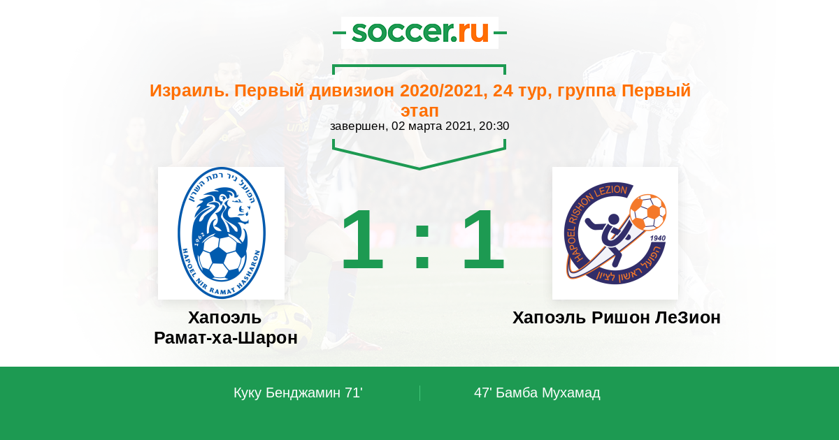 Израиль. Первый дивизион 01.04.2022 Хапоэль Ришон ЛеЗион Логотип футбольный клуб Хапоэль Ришон ЛеЗион 2:2 Логотип футбольный клуб Хапоэль Рамат-ха-Шарон Хапоэль Рамат-ха-Шарон