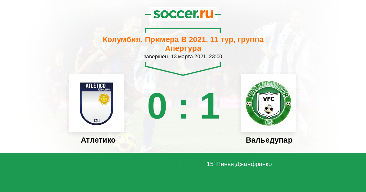 Колумбия. Примера B 17.04.2021 Вальедупар Логотип футбольный клуб Вальедупар 3:0 Логотип футбольный клуб Атлетико Кали Атлетико Кали