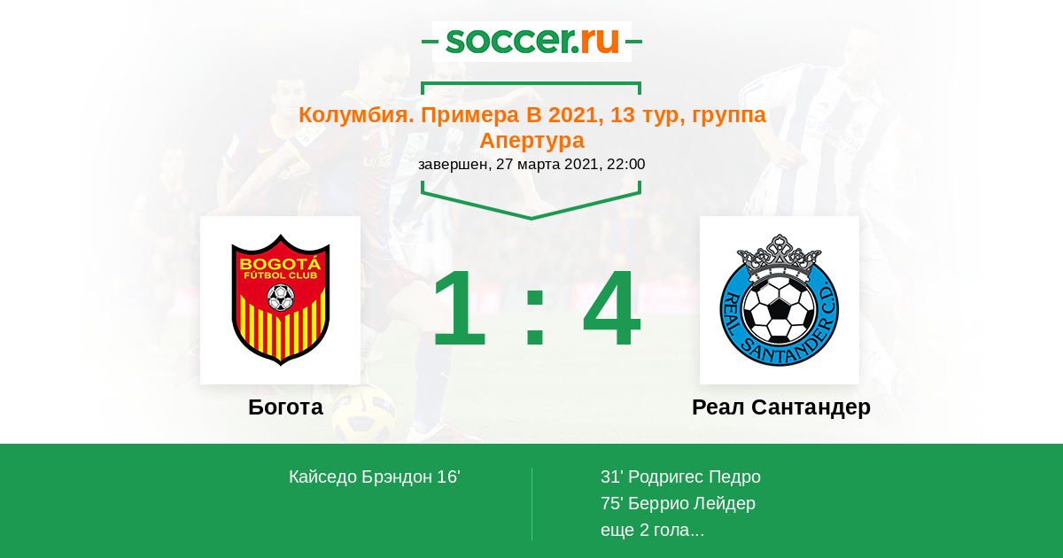 Колумбия. Примера B 26.03.2022 Богота Логотип футбольный клуб Богота 2:1 Логотип футбольный клуб Реал Сантандер (Букараманга) Реал Сантандер