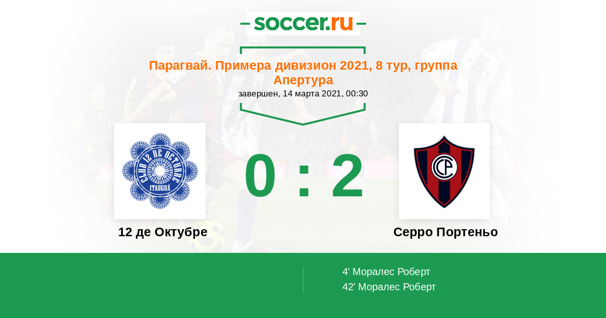 Парагвай. Примера дивизион 13.09.2021 12 де Октубре Логотип футбольный клуб 12 де Октубре (Итаугуа) 0:1 Логотип футбольный клуб Серро Портеньо (Асунсьон) Серро Портеньо
