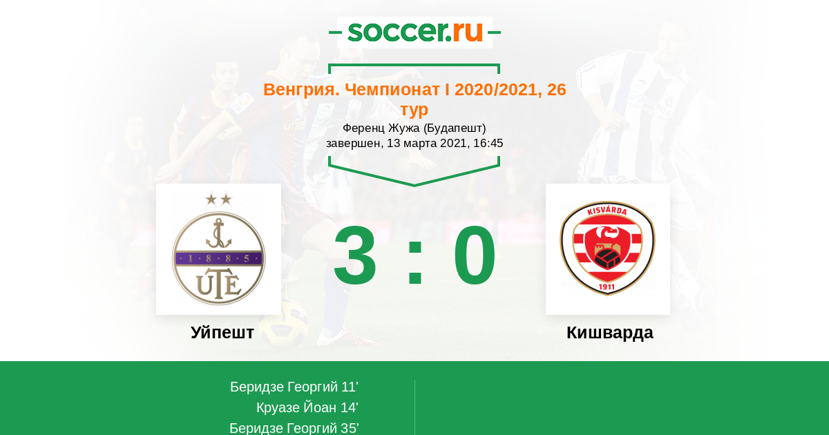 Венгрия. Чемпионат 1 15.12.2020 Кишварда Логотип футбольный клуб Кишварда 1:1 Логотип футбольный клуб Уйпешт (Будапешт) Уйпешт