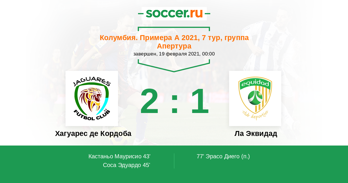 Колумбия. Примера А 26.09.2020 Хагуарес де Кордоба Логотип футбольный клуб Хагуарес де Кордоба (Монтерия) 2:0 Логотип футбольный клуб Ла Эквидад (Богота) Ла Эквидад