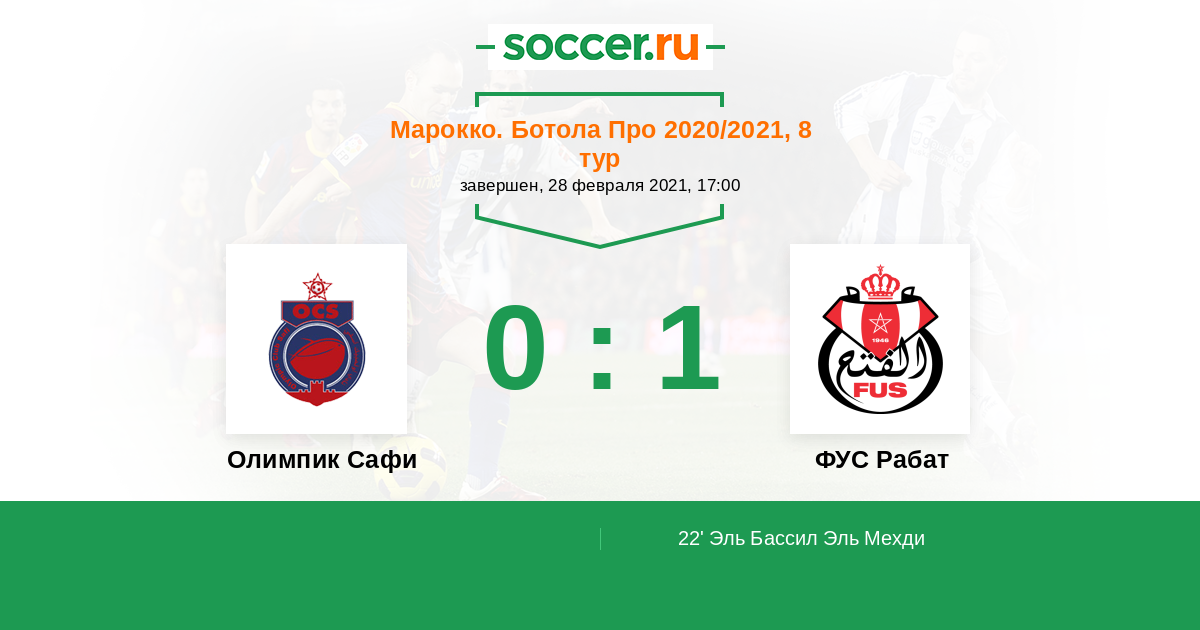 Марокко. Ботола Про 29.09.2021 ФУС Рабат Логотип футбольный клуб ФУС Рабат 0:1 Логотип футбольный клуб Олимпик Сафи Олимпик Сафи