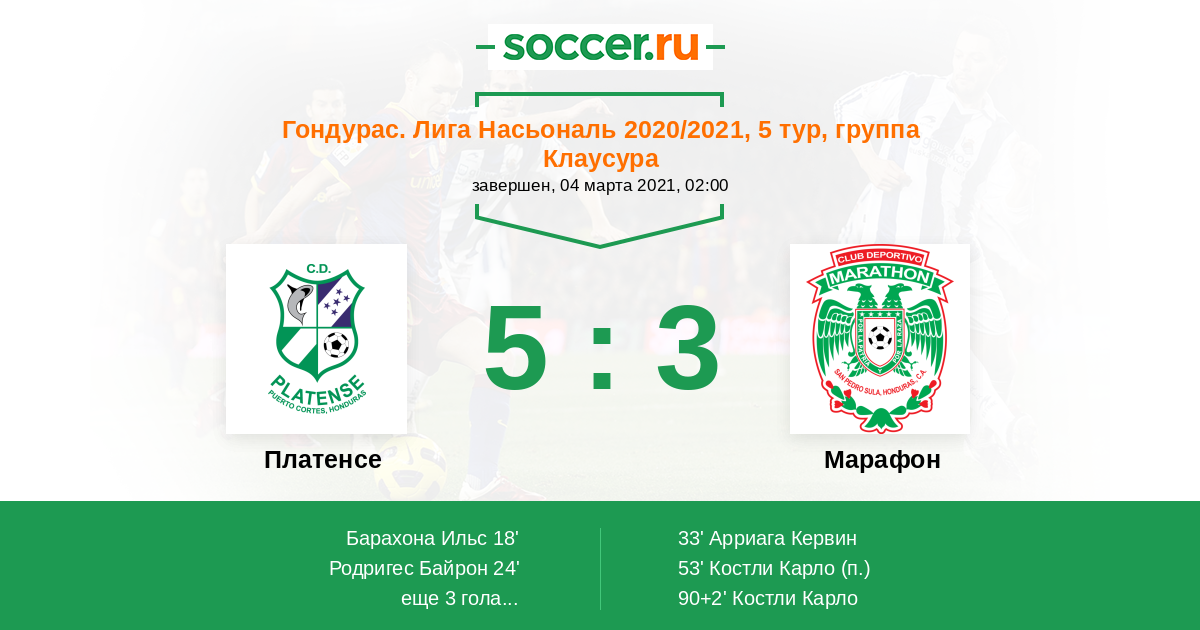 Гондурас. Лига Насьональ 04.04.2021 Марафон Логотип футбольный клуб Марафон (Сан-Педро-Сула) 1:0 Логотип футбольный клуб Платенсе (Пуэрто Кортес) Платенсе