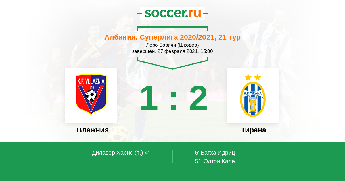 Албания. Суперлига 30.12.2020 Тирана Логотип футбольный клуб Тирана 1:1 Логотип футбольный клуб Влажния (Шкодер) Влажния