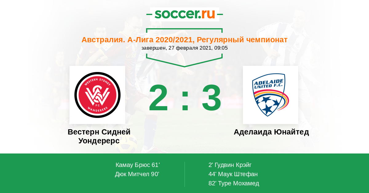 Австралия. А-Лига 21.02.2020 Вестерн Сидней Уондерерс Логотип футбольный клуб Вестерн Сидней Уондерерс 5:2 Логотип футбольный клуб Аделаида Юнайтед Аделаида Юнайтед
