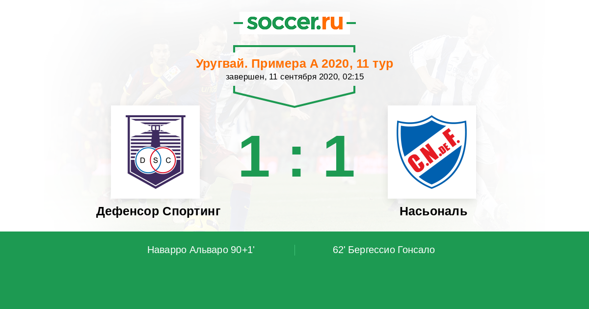 Уругвай. Примера A 08.11.2020 Насьональ Логотип футбольный клуб Насьональ (Монтевидео) 3:0 Логотип футбольный клуб Дефенсор Спортинг (Монтевидео) Дефенсор Спортинг