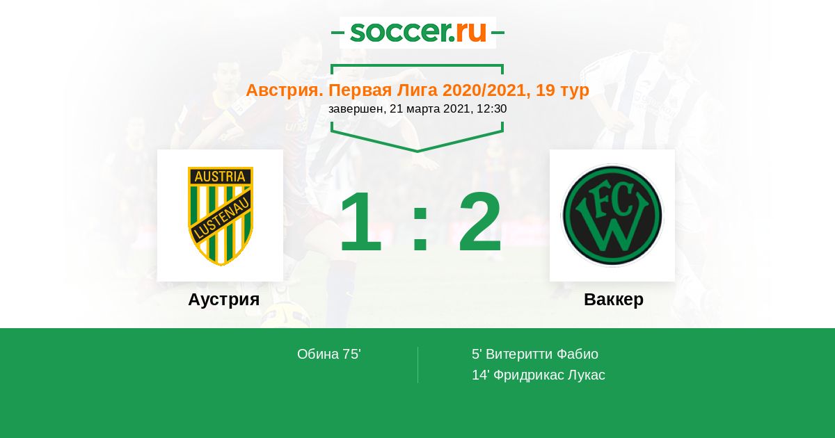 Австрия. Кубок 04.03.2020 Аустрия Логотип футбольный клуб Аустрия (Лустенау) 1:0 Логотип футбольный клуб Ваккер (Инсбрук) Ваккер