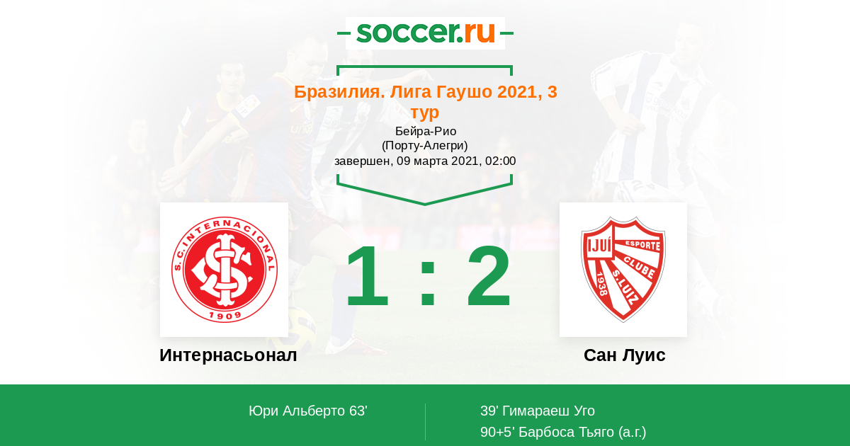 Бразилия. Лига Гаушо 21.03.2013 Интернасьонал Логотип футбольный клуб Интернасьонал (Порту-Алегри) 2:1 Логотип футбольный клуб Сан Луис Сан Луис
