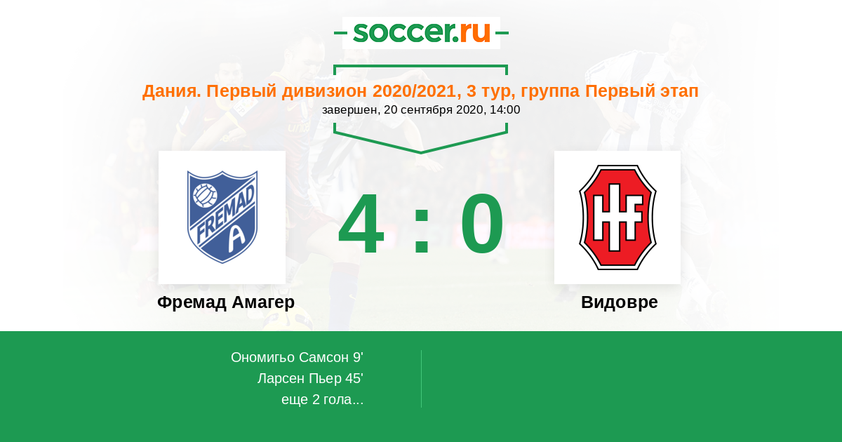 Дания. Первый дивизион 25.06.2020 Видовре Логотип футбольный клуб Видовре 3:0 Логотип футбольный клуб Фремад Амагер (Копенгаген) Фремад Амагер