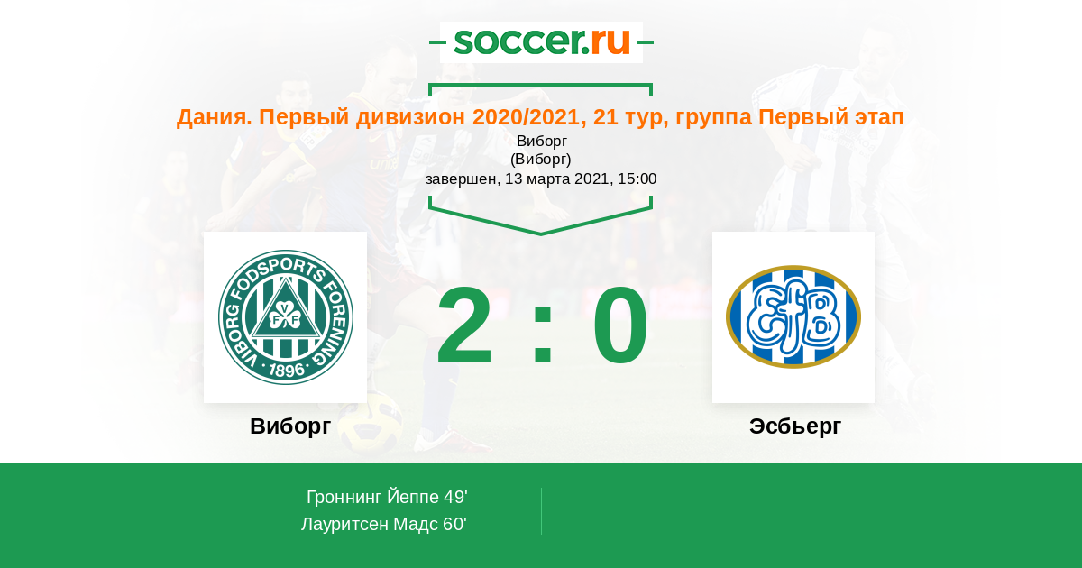 Дания. Первый дивизион 16.04.2021 Виборг Логотип футбольный клуб Виборг 4:0 Логотип футбольный клуб Эсбьерг Эсбьерг