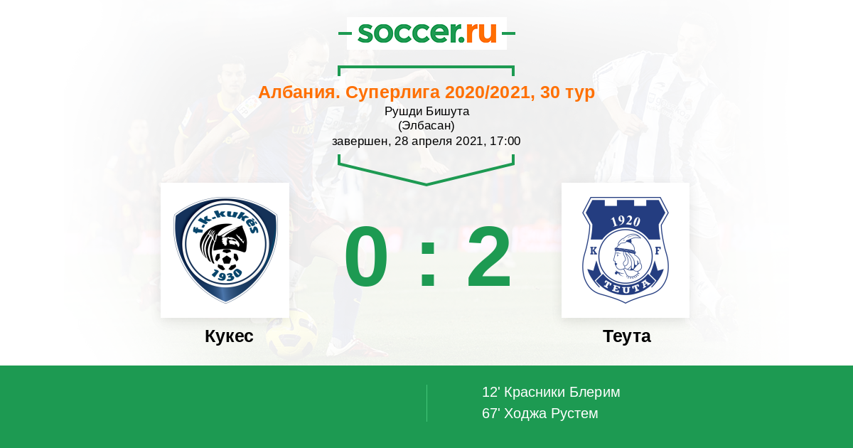 Албания. Суперлига 07.04.2013 Теута Логотип футбольный клуб Теута (Дуррес) 1:1 Логотип футбольный клуб Кукес Кукес