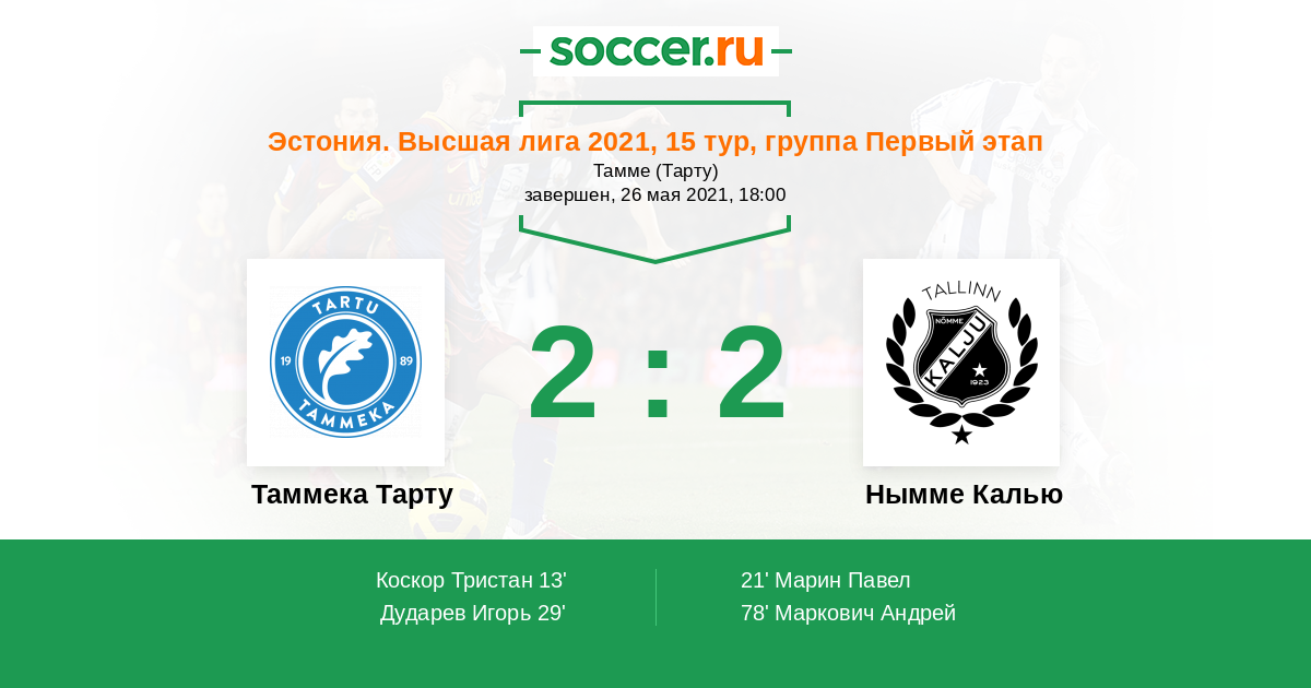 Эстония. Высшая лига 21.10.2018 Нымме Калью Логотип футбольный клуб Нымме Калью (Таллин) 2:2 Логотип футбольный клуб Таммека Тарту Таммека Тарту