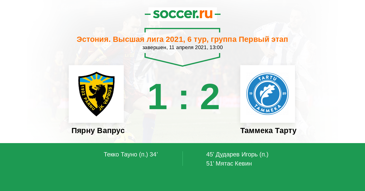 Эстония. Высшая лига 12.04.2022 Пярну Вапрус Логотип футбольный клуб Пярну Вапрус 1:2 Логотип футбольный клуб Таммека Тарту Таммека Тарту