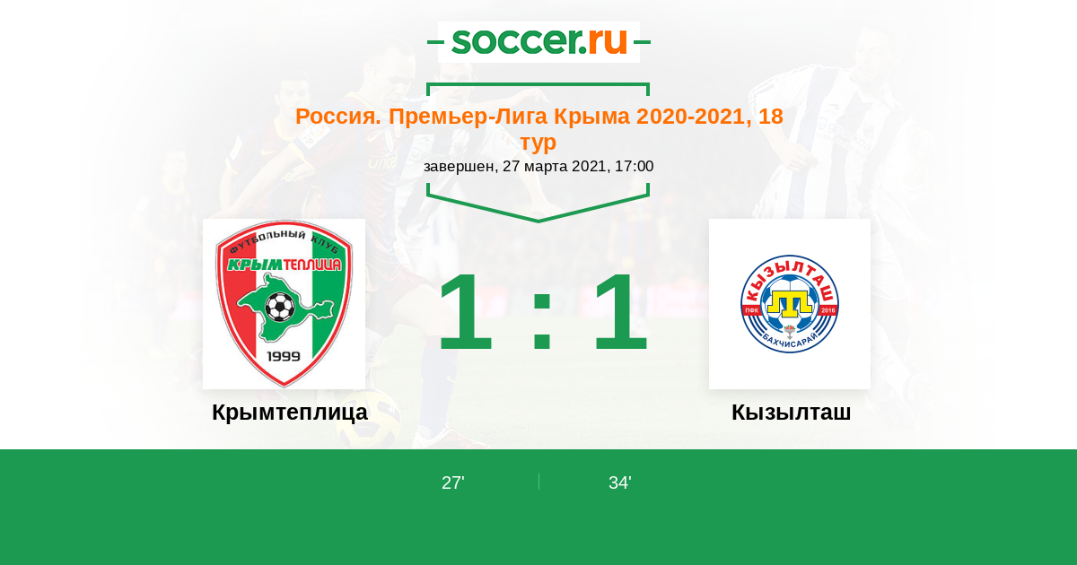 Россия. Премьер-Лига Крыма 14.10.2018 Крымтеплица Логотип футбольный клуб Крымтеплица (Молодежное) 0:0 Логотип футбольный клуб Кызылташ (Бахчисарай) Кызылташ