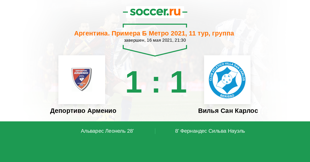 Аргентина. Примера Б Метро 10.10.2011 Вилья Сан Карлос Логотип футбольный клуб Вилья Сан Карлос (Берисо) 1:1 Логотип футбольный клуб Депортиво Арменио Депортиво Арменио