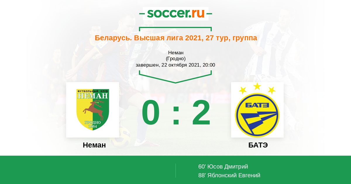 Беларусь. Высшая лига 12.06.2021 БАТЭ Логотип футбольный клуб БАТЭ (Борисов) 3:0 Логотип футбольный клуб Неман (Гродно) Неман
