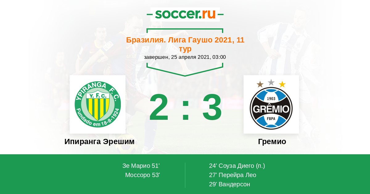 Бразилия. Лига Гаушо 17.04.2011 Ипиранга Эрешим Логотип футбольный клуб Ипиранга Эрешим 1:1 Логотип футбольный клуб Гремио (Порту-Алегри) Гремио
