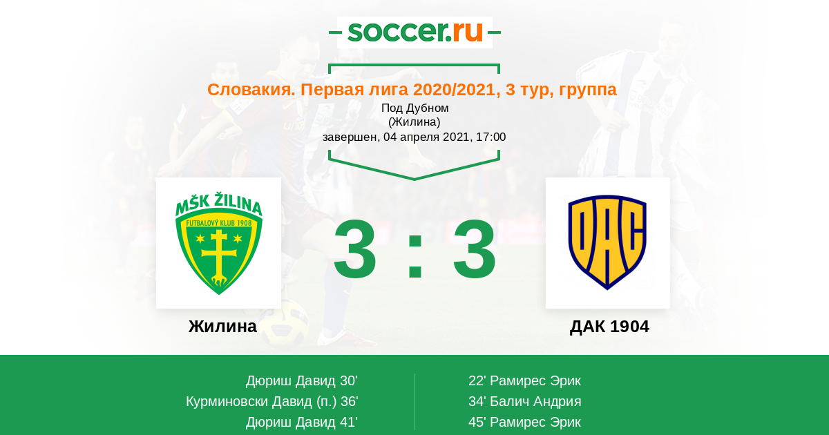 Словакия. Суперлига 22.04.2018 Жилина Логотип футбольный клуб Жилина 2:3 Логотип футбольный клуб ДАК 1904 (Дунайська Стреда) ДАК 1904