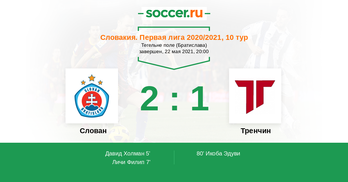 Словакия. Суперлига 31.07.2021 Слован Логотип футбольный клуб Слован (Братислава) 2:0 Логотип футбольный клуб Тренчин Тренчин