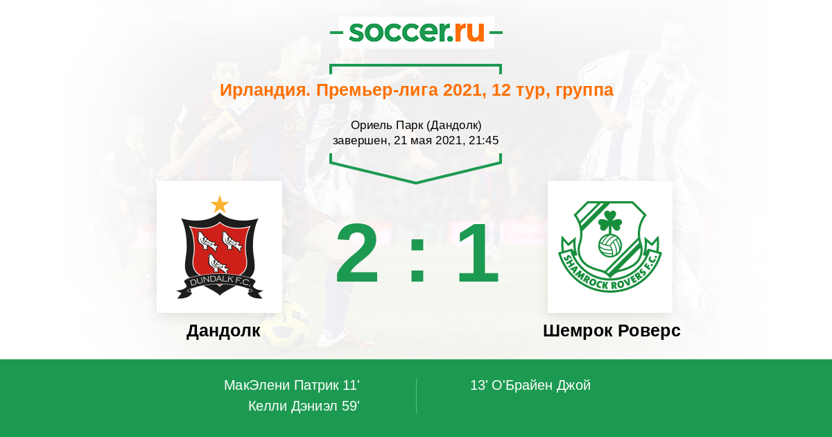 Ирландия. Премьер-лига 02.07.2021 Шемрок Роверс Логотип футбольный клуб Шемрок Роверс (Дублин) 3:1 Логотип футбольный клуб Дандолк Дандолк