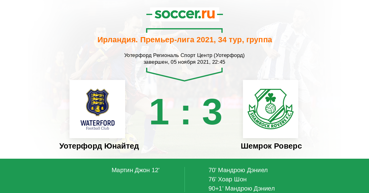 Ирландия. Премьер-лига 18.06.2021 Уотерфорд Юнайтед Логотип футбольный клуб Уотерфорд Юнайтед 1:4 Логотип футбольный клуб Шемрок Роверс (Дублин) Шемрок Роверс
