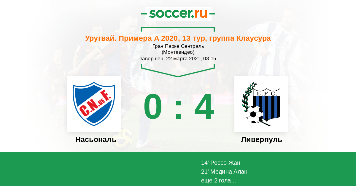 Уругвай. Примера A 29.03.2014 Ливерпуль Логотип футбольный клуб Ливерпуль (Монтевидео) 1:0 Логотип футбольный клуб Насьональ (Монтевидео) Насьональ