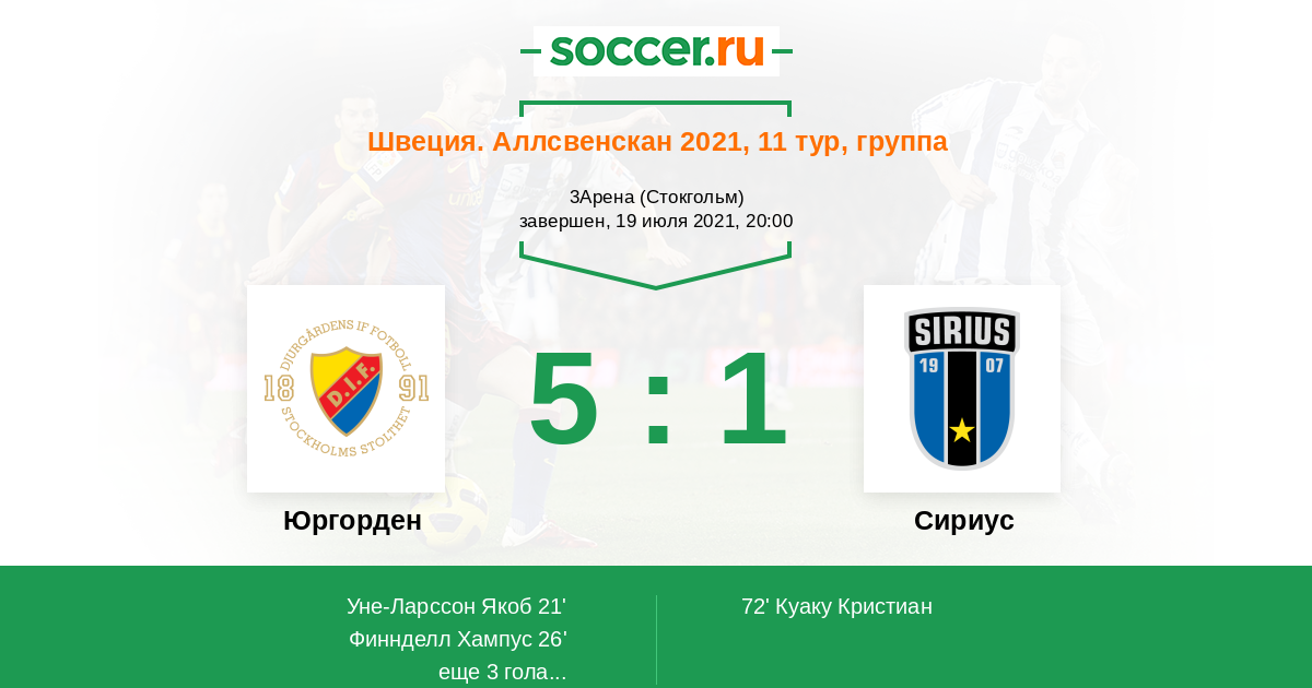Швеция. Аллсвенскан 29.08.2021 Сириус Логотип футбольный клуб Сириус (Уппсала) 1:0 Логотип футбольный клуб Юргорден (Стокгольм) Юргорден