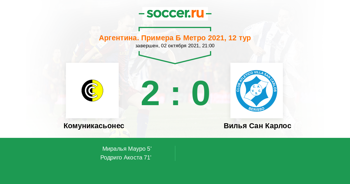Аргентина. Примера Б Метро 02.04.2023 Вилья Сан Карлос Логотип футбольный клуб Вилья Сан Карлос (Берисо) 5:1 Логотип футбольный клуб Комуникасьонес (Буэнос-Айрес) Комуникасьонес