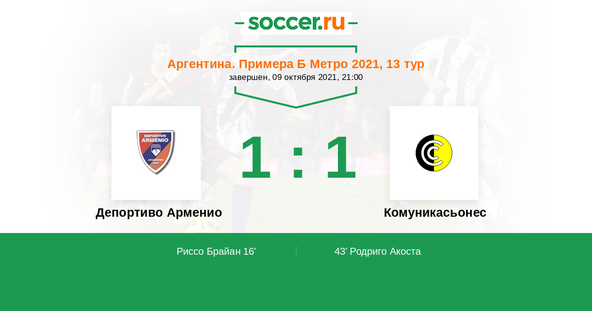 Аргентина. Примера Б Метро 01.11.2014 Комуникасьонес Логотип футбольный клуб Комуникасьонес (Буэнос-Айрес) 1:1 Логотип футбольный клуб Депортиво Арменио Депортиво Арменио