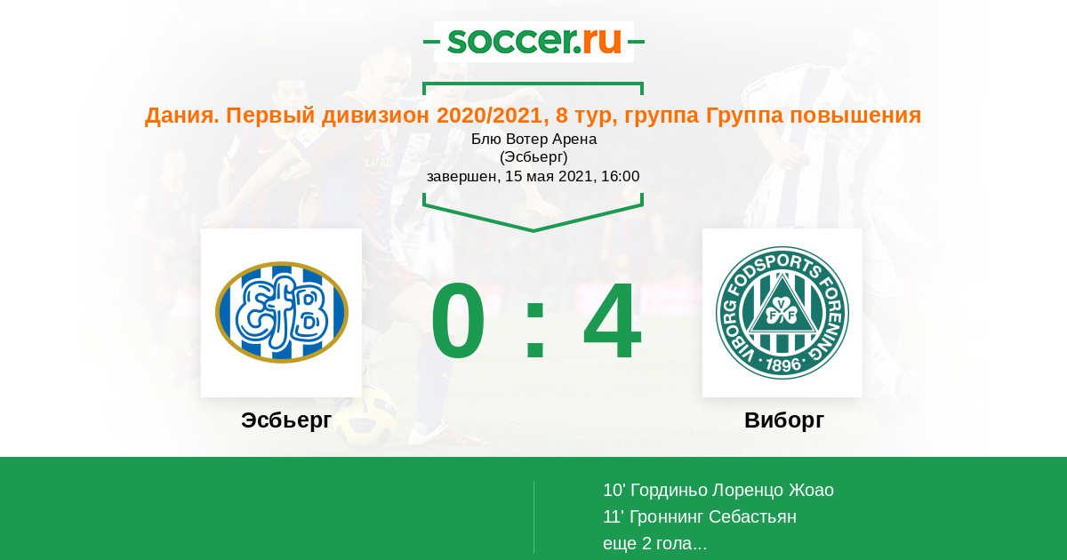 Дания. Первый дивизион 16.04.2021 Виборг Логотип футбольный клуб Виборг 4:0 Логотип футбольный клуб Эсбьерг Эсбьерг