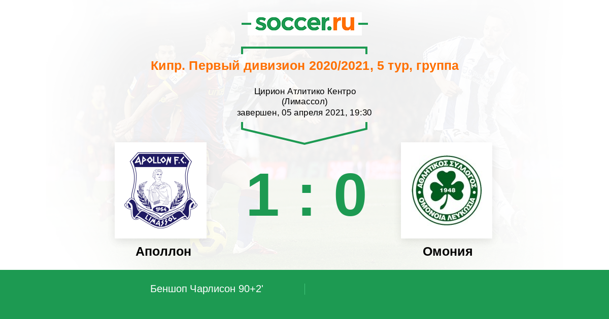 Кипр. Первый Дивизион 04.04.2018 Аполлон Логотип футбольный клуб Аполлон (Лимассол) 3:0 Логотип футбольный клуб Омония (Никосия) Омония