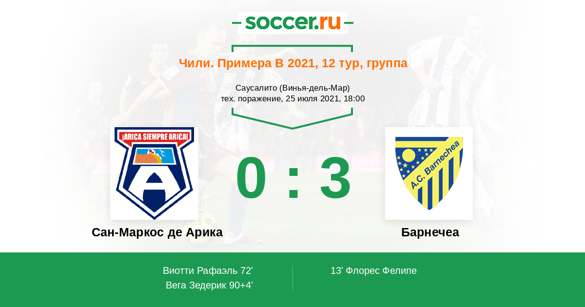 Чили. Примера В 30.07.2017 Сан-Маркос де Арика Логотип футбольный клуб Сан-Маркос де Арика 3:1 Логотип футбольный клуб Барнечеа (Сантьяго) Барнечеа
