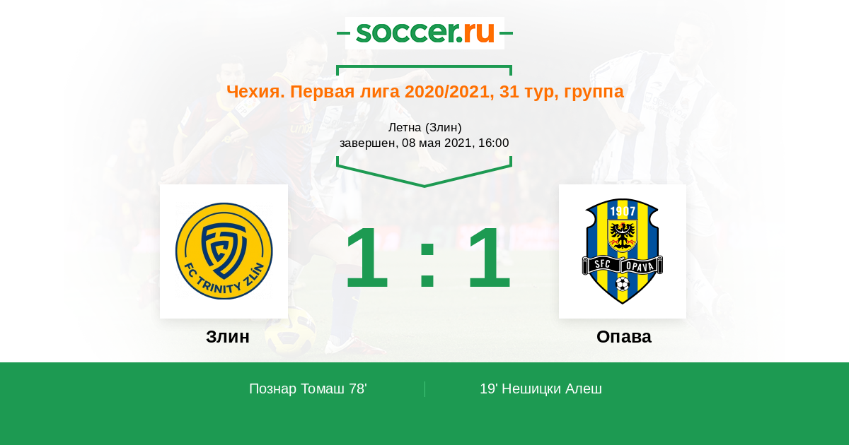 Чехия. Первая Лига 20.06.2020 Злин Логотип футбольный клуб Злин 3:1 Логотип футбольный клуб Опава Опава