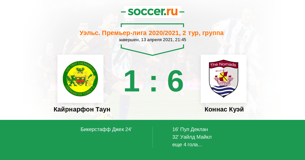 Уэльс. Премьер-Лига 05.04.2019 Кайрнарфон Таун Логотип футбольный клуб Кайрнарфон Таун 1:0 Логотип футбольный клуб Коннас Куэй Коннас Куэй