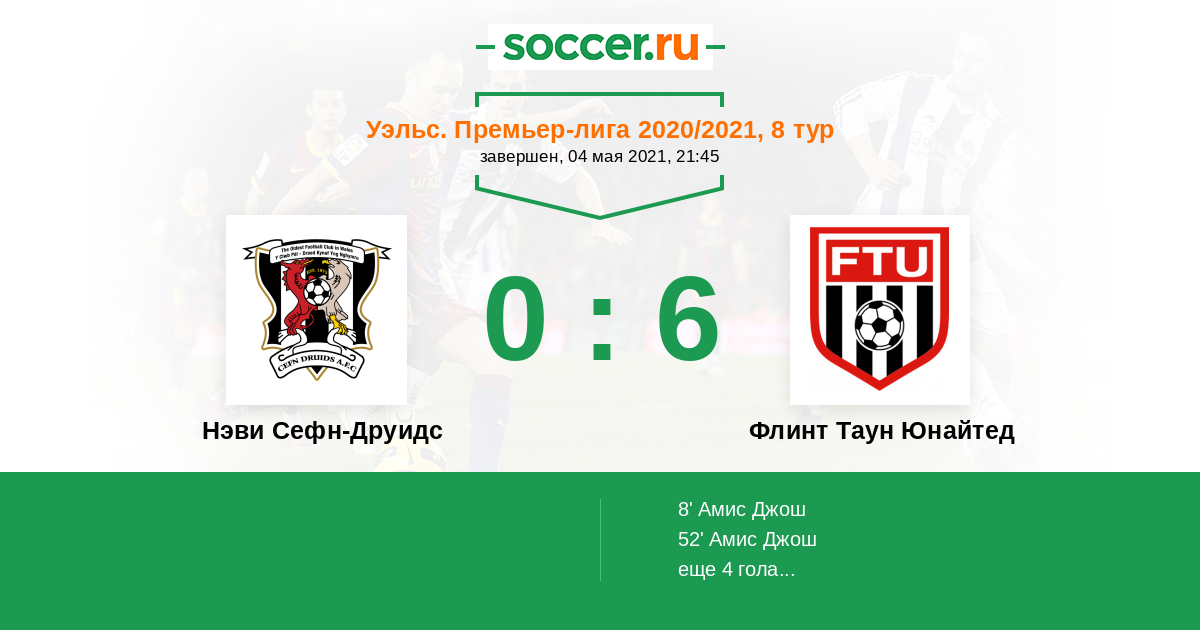 Уэльс. Премьер-Лига 13.04.2021 Флинт Таун Юнайтед Логотип футбольный клуб Флинт Таун Юнайтед 5:0 Логотип футбольный клуб Нэви Сефн-Друидс (Сефн Моур) Нэви Сефн-Друидс