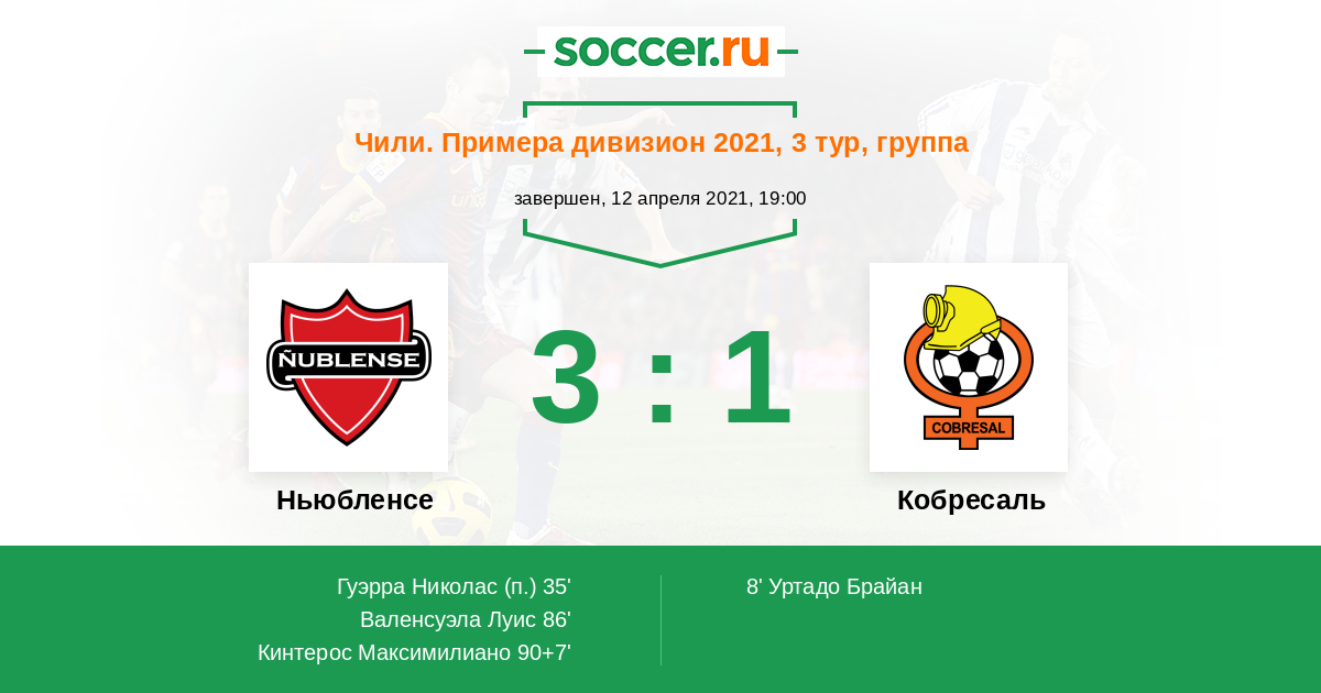 Чили. Примера дивизион 06.09.2021 Кобресаль Логотип футбольный клуб Кобресаль (Эль-Сальвадор) 4:1 Логотип футбольный клуб Ньюбленсе (Чильян) Ньюбленсе