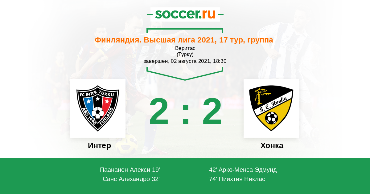 Финляндия. Высшая лига 21.07.2019 Интер Логотип футбольный клуб Интер (Турку) 3:1 Логотип футбольный клуб Хонка (Эспоо) Хонка