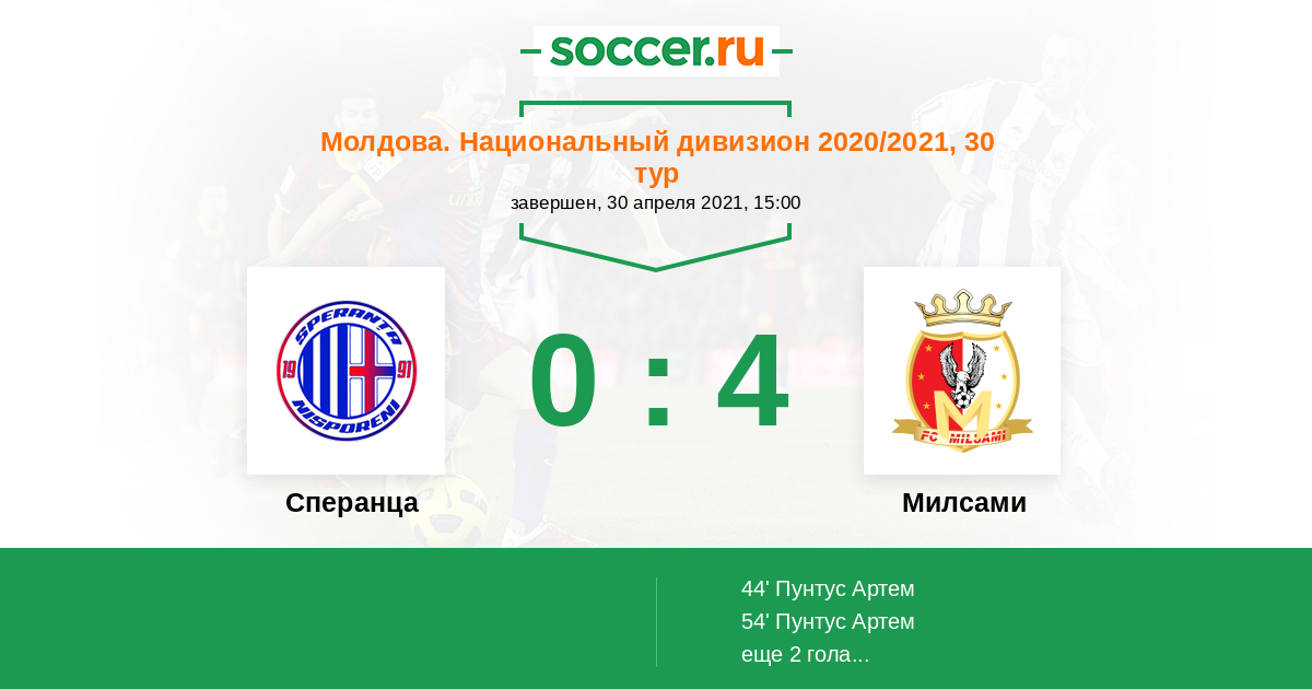 Молдова. Национальный дивизион 26.09.2020 Сперанца Логотип футбольный клуб Сперанца (Крихана Веке) 0:1 Логотип футбольный клуб Милсами (Оргеев) Милсами