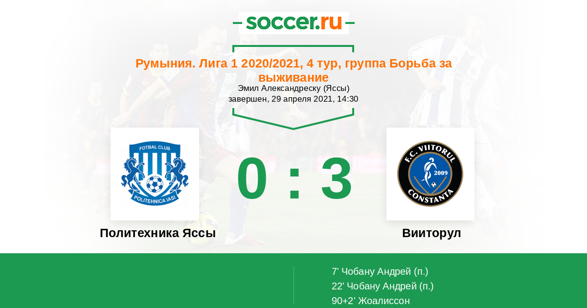 Румыния. Лига 1 08.04.2021 Вииторул Логотип футбольный клуб Вииторул (Констанца) 1:2 Логотип футбольный клуб Политехника Яссы Политехника Яссы