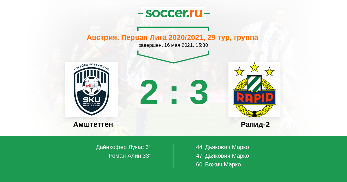 Австрия. Первая Лига 22.05.2022 Рапид-2 Логотип футбольный клуб Рапид-2 (Вена) 5:2 Логотип футбольный клуб Амштеттен Амштеттен