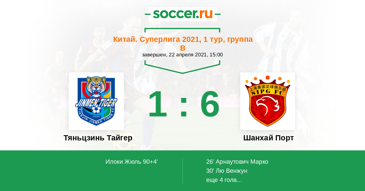 Китай. Суперлига 15.08.2021 Шанхай Порт Логотип футбольный клуб Шанхай Порт 5:0 Логотип футбольный клуб Тяньцзинь Тайгер Тяньцзинь Тайгер