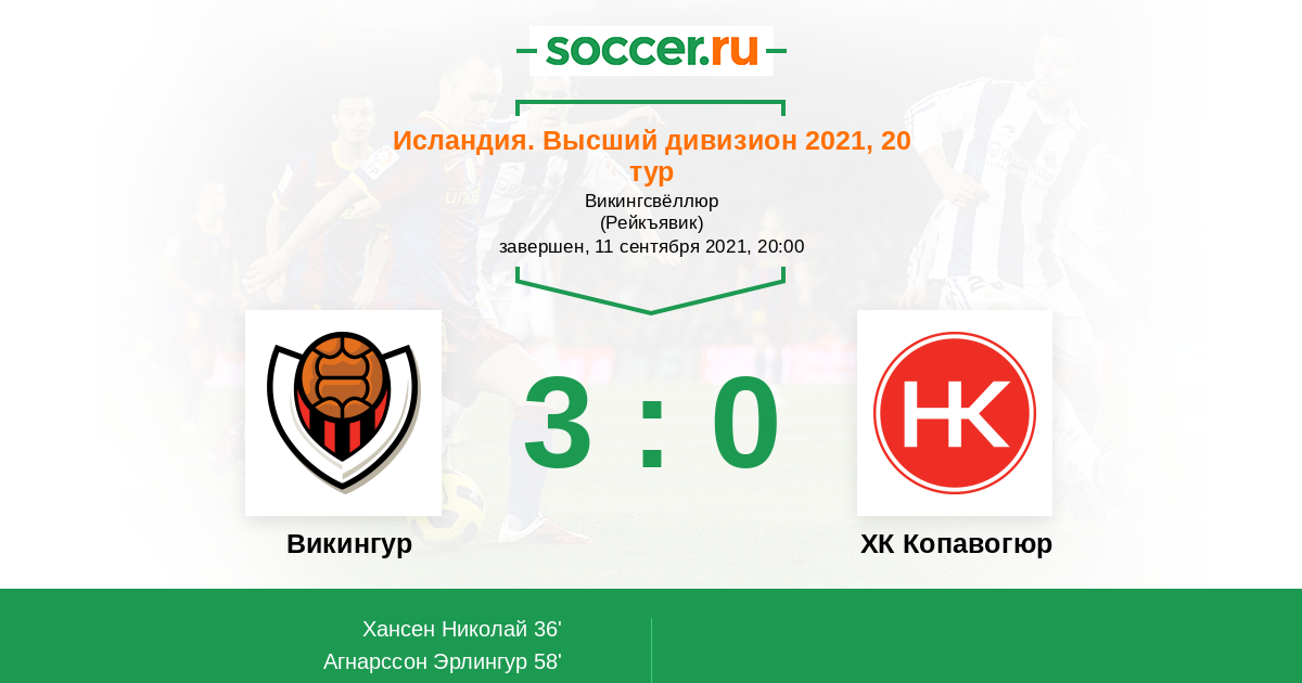 Исландия. Высший дивизион 21.09.2020 Викингур Логотип футбольный клуб Викингур (Рейкьявик) 1:1 Логотип футбольный клуб ХК Копавогюр (Копавогур) ХК Копавогюр