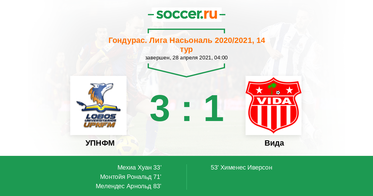 Гондурас. Лига Насьональ 21.04.2022 Вида Логотип футбольный клуб Вида (Ла-Сейба) 4:2 Логотип футбольный клуб УПНФМ (Тегусигальпа) УПНФМ