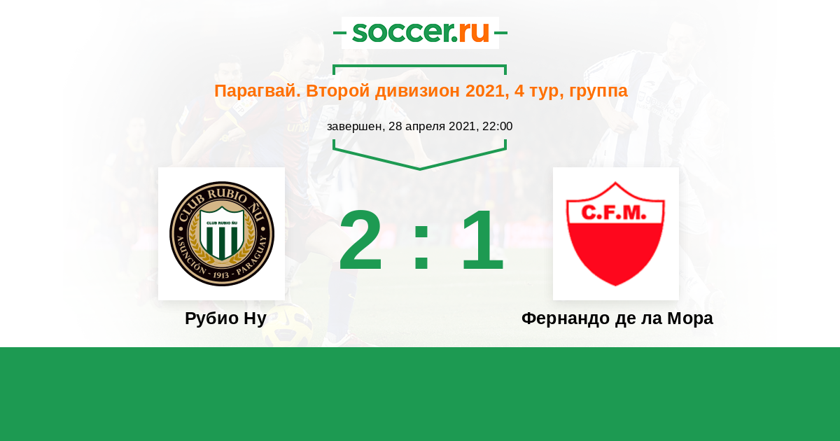 Парагвай. Второй дивизион 01.08.2021 Фернандо де ла Мора Логотип футбольный клуб Фернандо де ла Мора 2:2 Логотип футбольный клуб Рубио Ну (Асунсьон) Рубио Ну