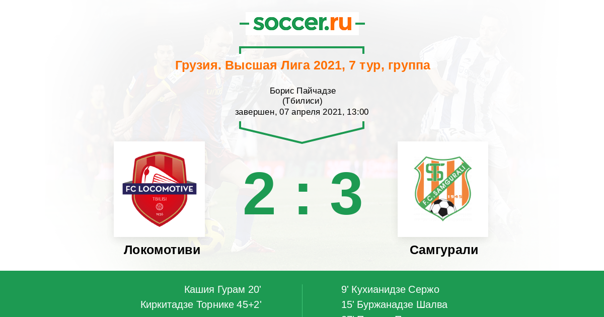 Грузия. Первый дивизион 02.04.2014 Локомотиви Логотип футбольный клуб Локомотиви (Тбилиси) 6:2 Логотип футбольный клуб Самгурали (Цхалтубо) Самгурали
