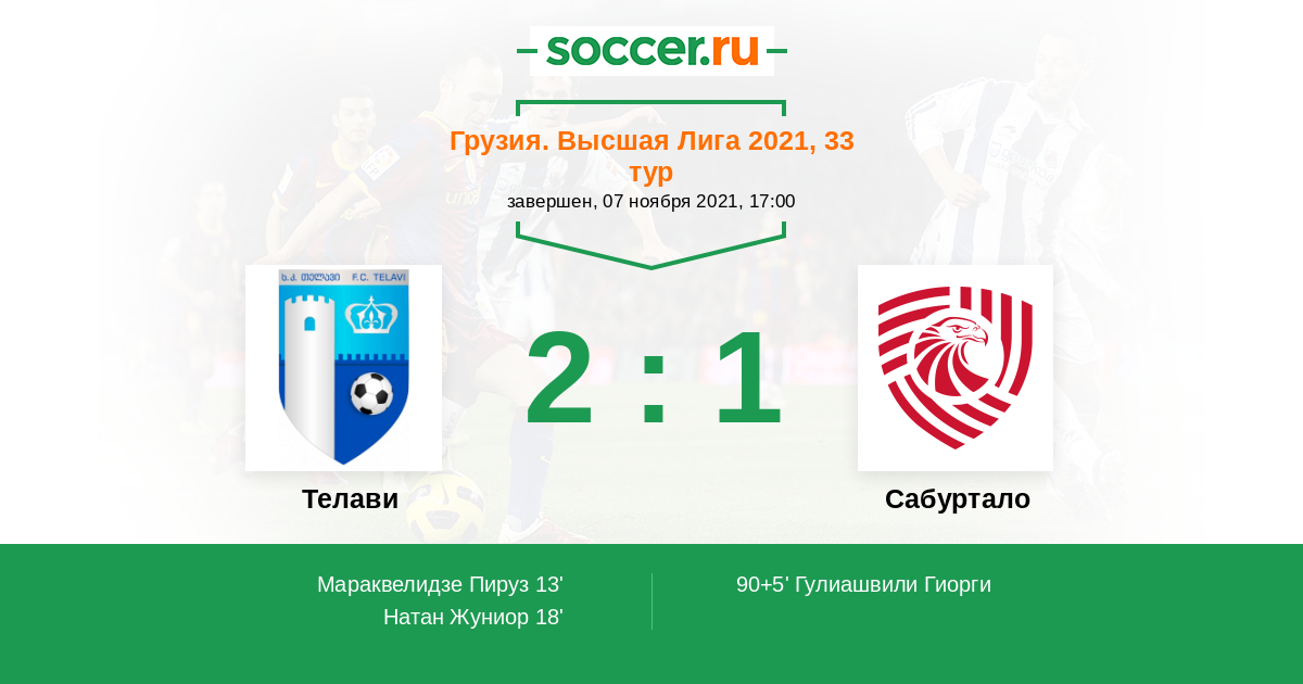 Грузия. Высшая лига 16.09.2021 Сабуртало Логотип футбольный клуб Сабуртало (Тбилиси) 2:1 Логотип футбольный клуб Телави Телави